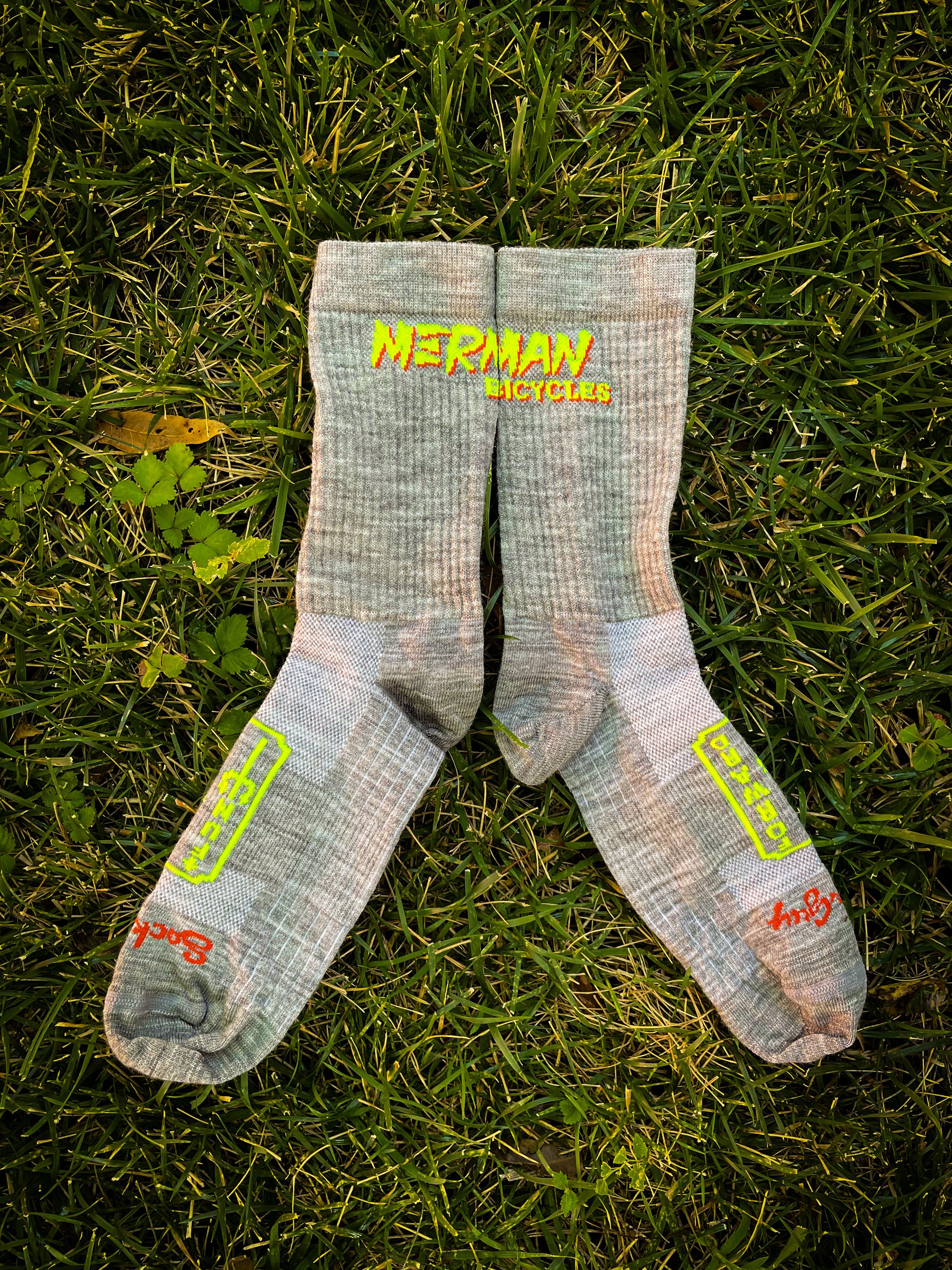 are your feet down to party? keep them dogs looking fresh with a pair of Merman socks. Sockguy style. Woolies with a nice grey blend and some high viz Merman logos to keep the wildlife on their toes.
