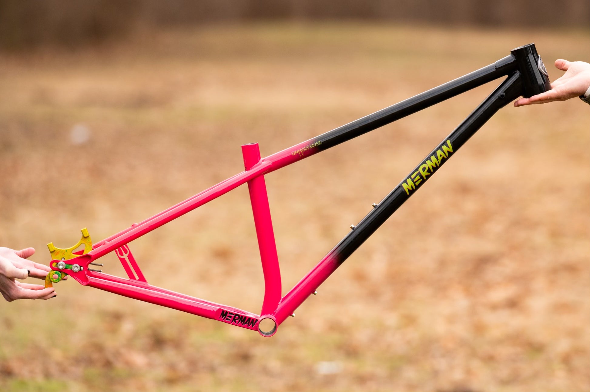 Reynolds 725 tubing, fully-sleeved internal cable routing. Compatible with 120mm-150mm travel forks, this frame has room for 29x2.6 (bigger with the dropout to the back) and also works great with mullet wheels. All of our frames feature sliding dropouts for worshipping the one true gear (or optimizing your geometry based on your fork travel while keeping your gears). You can even use angle-adjusting headsets to tweak the geometry to suit your ride style.